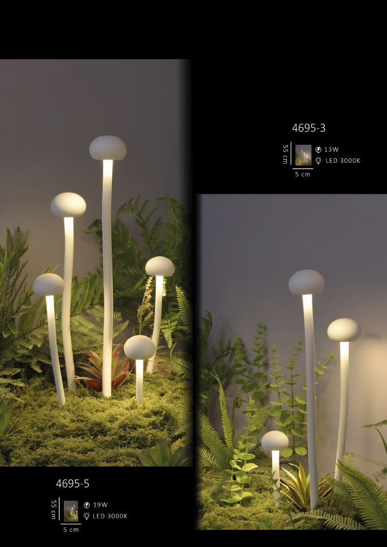 Bu ürün, modern ve doğal bir estetiği birleştiren, mantar silüetinde tasarlanmış dekoratif bir aydınlatma grubudur. Özellikle bitki ve doğal peyzaj düzenlemelerinde, iç mekan veya dış mekanlarda masalsı ve yumuşak bir atmosfer oluşturmak amacıyla kullanılır.