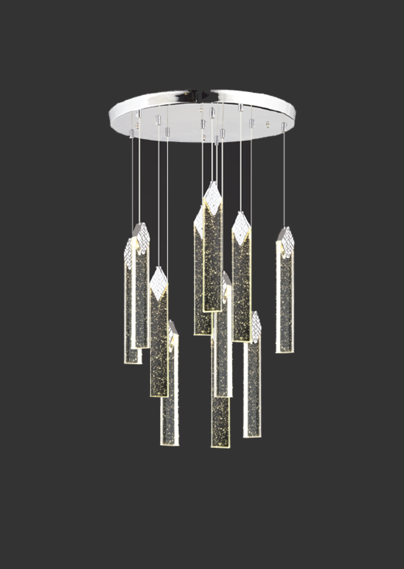 Lüks tasarım anlayışını modern çizgilerle harmanlayan bu 11’li kristal çubuk avize, yaşam alanlarına prestijli bir dokunuş katıyor. Altın detaylı buz efektli çubukların asimetrik sarkıt düzeni, ışığın yansımasını adeta bir sanat eserine dönüştürüyor. Otel lobilerinden yüksek tavanlı salonlara kadar her ortamda etkileyici bir atmosfer yaratır.