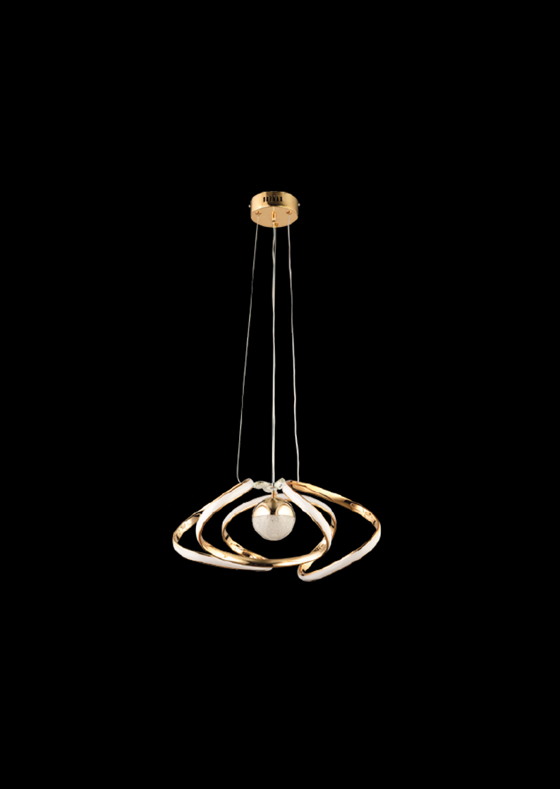 Eşsiz kıvrımları ve göz alıcı altın detaylarıyla dikkat çeken bu LED avize, bulunduğu ortama adeta sanat galerisi havası katıyor. Altın tonlarındaki dairesel halkaları ve merkezdeki cam küresiyle ışığı estetik bir biçimde dağıtarak şıklığı zirveye taşıyor.
