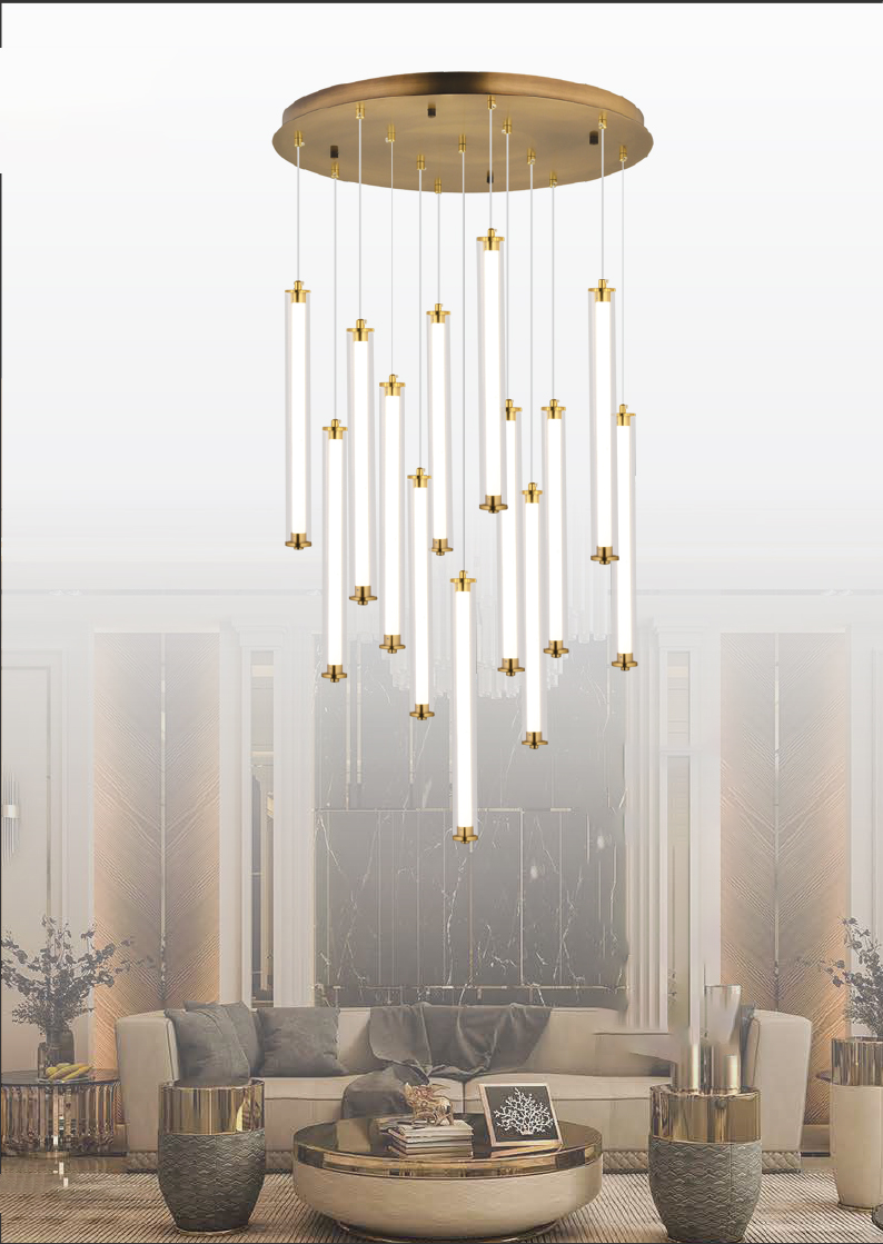 Altın rengi detaylarla zenginleştirilmiş bu çoklu tüp LED avize, lüks yaşam alanlarını adeta bir sanat eserine dönüştürüyor. Farklı yüksekliklerde konumlandırılmış ışık tüpleri, mekâna derinlik ve hareket kazandırırken, tavandan zemine zarif bir ışık dansı sunar. Özellikle yüksek tavanlı salonlar, otel lobileri ve gösterişli mekanlar için tasarlanmıştır.